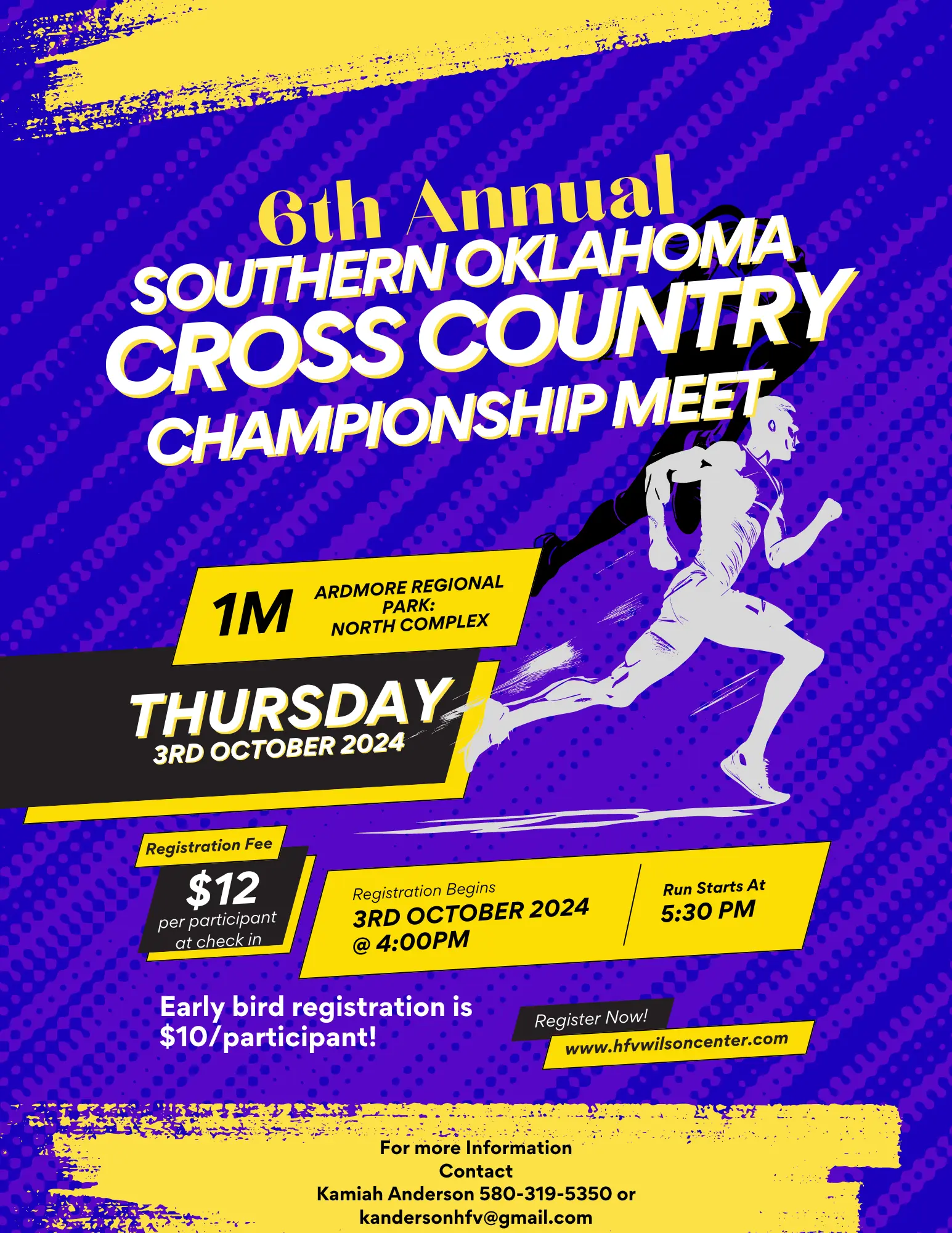 Entry Fee: Early Bird $10 per person Check In $12 per person (Registration begins at 4:00pm) Please bring a check or cash to the meet. All checks need to be made out to HFV Wilson Community Center. Early registration can be done online at www.hfvwilsoncenter.com.  Location and course:We will be running at Regional Park located in Ardmore...